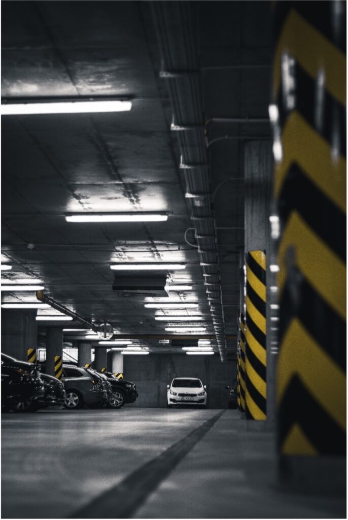 Ezek tipikusan a teremgarázsban, tartós felfestéssel jelzett parkolóhelyek, amelyek a jogszabályoknak megfelelő minimum méretekkel, belmagassággal rendelkeznek.